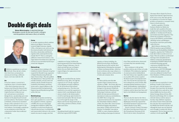 Exhibition acquisitions are well and truly back . Since my last column there have been 14 transactions announced involving 12 different buyers . Let ’ s start with the UK .