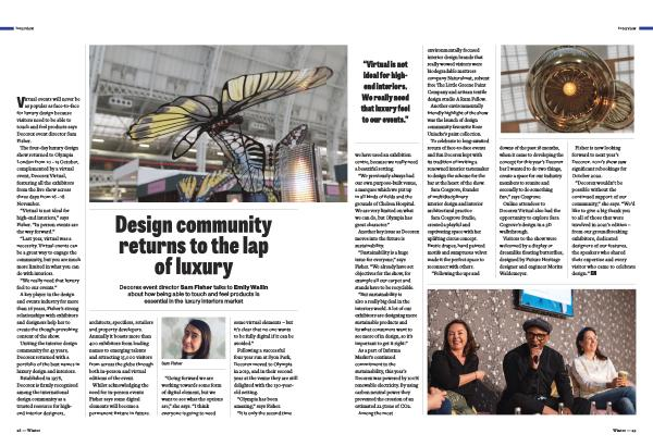 Fisher is now looking forward to next year ’ s Decorex . 2021 ’ s show saw significant rebookings for October 2022 . “ Decorex wouldn ’ t be possible without the continued support of our community ,” she says . “ We ’ d like to give a big thank you to all of those that were involved in 2021 ’ s edition – from our groundbreaking exhibitors , dedicated designers of our features , the speakers who shared their expertise and every visitor who came to celebrate design .” EN |