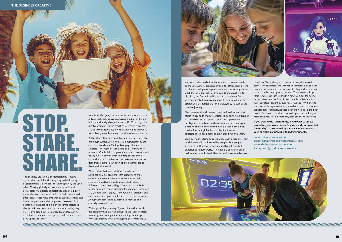 But beyond the strategy decks and creative sessions, their work is rooted in understanding people. Real people. Audiences with expectations shaped by a digital-first, experience-hungry world. They don’ t chase gimmicks or hollow spectacle. Instead, they design for genuine human reactions. The wide-eyed moment of awe, the shared glance of excitement, the instinct to reach for a phone and capture the moment. In a noisy world, they make sure their clients are the ones getting noticed. Their mantra; Stop. Stare. Share. isn’ t just a line; it’ s a creative filter for every project they take on. Does it stop people in their tracks? Will they stare, caught by surprise or wonder? Will they feel the irresistible urge to share it, whether in person or across social feeds? If the answer isn’ t clear, they go back and push harder. For brands, destinations, and operators looking for more than predictable solutions, they are the team to call.