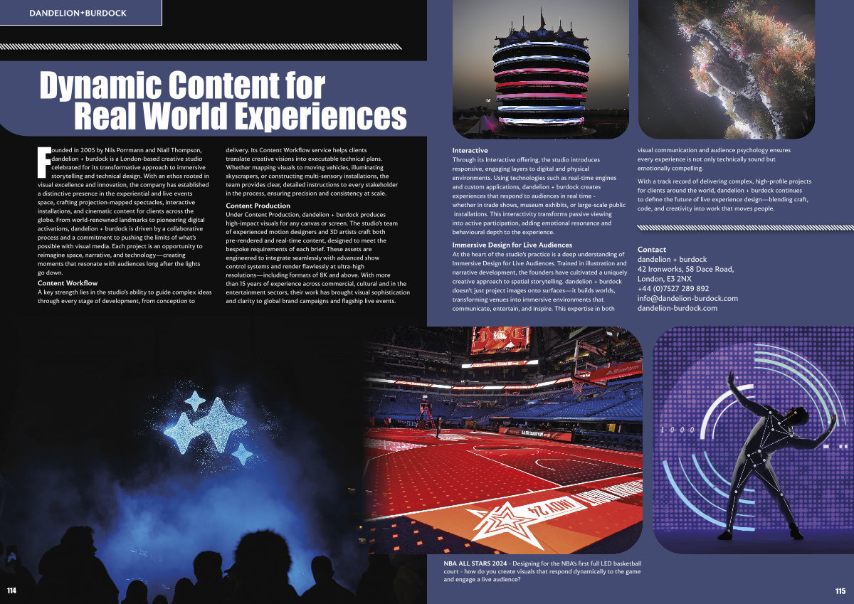 Founded in 2005 by Nils Porrmann and Niall Thompson, dandelion + burdock is a London-based creative studio celebrated for its transformative approach to immersive storytelling and technical design. With an ethos rooted in visual excellence and innovation, the company has established a distinctive presence in the experiential and live events space, crafting projection-mapped spectacles, interactive installations, and cinematic content for clients across the globe. From world-renowned landmarks to pioneering digital activations, dandelion + burdock is driven by a collaborative process and a commitment to pushing the limits of what’ s possible with visual media. Each project is an opportunity to reimagine space, narrative, and technology— creating moments that resonate with audiences long after the lights go down. Content Workflow A key strength lies in the studio’ s ability to guide complex ideas through every stage of development, from conception to delivery. Its Content Workflow service helps clients translate creative visions into executable technical plans. Whether mapping visuals to moving vehicles, illuminating skyscrapers, or constructing multi-sensory installations, the team provides clear, detailed instructions to every stakeholder in the process, ensuring precision and consistency at scale.