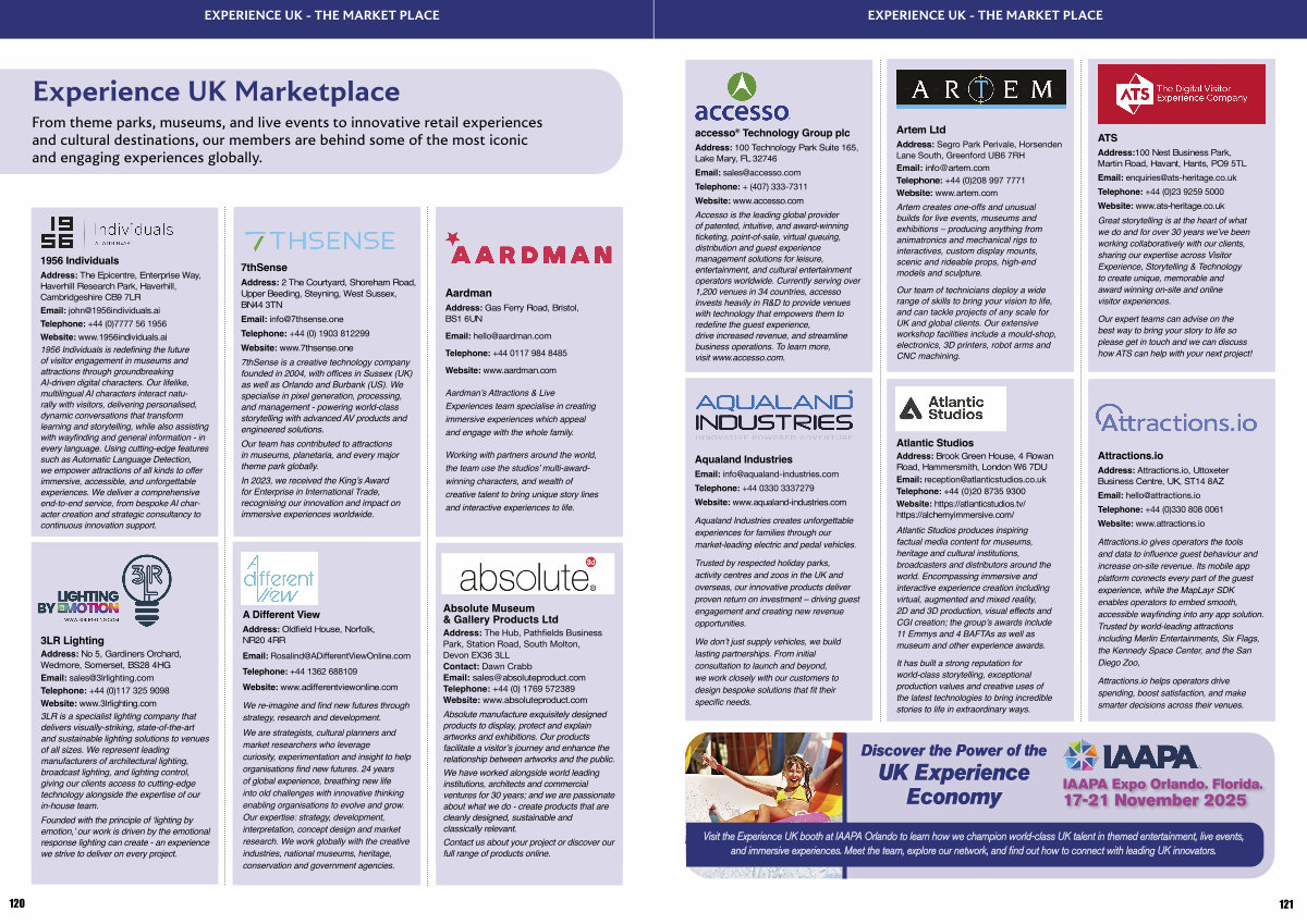 Visit the Experience UK booth at IAAPA Orlando to learn how we champion world-class UK talent in themed entertainment, live events, and immersive experiences. Meet the team, explore our network, and find out how to connect with leading UK innovators.