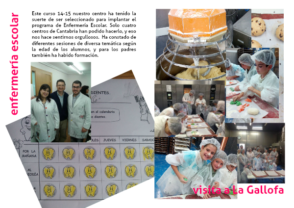 Este curso 14-15 nuestro centro ha tenido la suerte de ser seleccionado para implantar el programa de Enfermería Escolar. Solo cuatro centros de Cantabria han podido hacerlo, y eso nos hace sentirnos orgullosos. Ha constado de diferentes sesiones de diversa temática según la edad de los alumnos, y para los padres también ha habido formación.