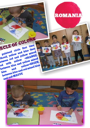 We painteed circle first time with:red, yellow and blue then between red and yellow mixed red with yellow =ORANGE; between blue and yellow mixed blue and yellow=GREEN, between blue and red mixed blue and red=MAUVE