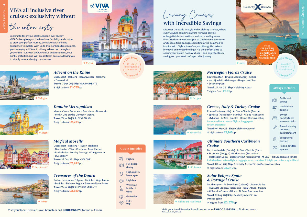 Discover the world in style with Celebrity Cruises, where every voyage combines award-winning service, unforgettable destinations, and outstanding value. From Mediterranean escapes to Caribbean adventures and scenic fjord sailings, each itinerary is designed to inspire. With flights, transfers, and thoughtful extras included on selected sailings, it’ s the perfect time to secure your dream holiday at sea – and enjoy fantastic savings on your next unforgettable journey.