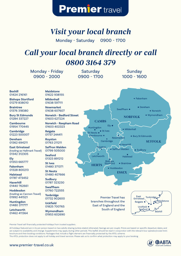 Premier Travel has branches throughout the East of England and the