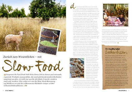 as mallorquinische Essen ist eine reine Freude, und nur wenige können den herzhaften Gerichten widerstehen, die in rustikalen Terrakottaschalen serviert werden. Dennoch erfuhr die alte landwirtschaftliche Tradition in den letzten Jahrzehnten eine Bedrohung durch massenweise importierte Produkte, und viele lokale Produkte sind fast vollständig verschwunden. Glücklicherweise ist das Interesse wieder aufgefacht: Die Slow-Food-Bewegung auf Mallorca wird immer umfangreicher. Der Begriff „Slow Food“ bezieht sich dabei nicht auf langsam kriechende Caracoles (Schnecken), obwohl Sie diese höchstwahrscheinlich auf vielen mallorquinischen Speisekarten finden werden. Die Slow-Food-Bewegung wurde 1986 vom Italiener Carlo Petrini ins Leben gerufen, der eine Alternative zum Fast-Food-Hype auf der Welt erschaffen wollte. Unter seiner Führung möchte die Bewegung, die heute mehr als 100.000 Mitglieder in 150 Ländern zählt, regional produzierte Lebensmittel und traditionelle Landwirtschaft und Gastronomie fördern. Kurz gesagt: gute Lebensmittel, die nachhaltig produziert werden, oder „ÖkoGastronomie“, wie Carlo Petrini es nennt. In Mallorca findet die Slow-Food-Bewegung viele Unterstützer. Chefköche, Bauern, Fischer, Bäcker und Kunsthandwerker bringen regional angebaute Produkte zurück in den Alltag. Fisch und Schalentiere werden in den Gewässern um die Insel auf verantwortungsvollere Weise gefangen, und nur ältere Olivenbäume werden für die Herstellung von Olivenöl herangezogen. Fast ausgestorbene Baum- und Kräutersorten wie Birne, Kirsche, Feige und Mandel wachsen wieder auf der Insel, und die Weiden sind voll von frei laufenden Lämmern und den traditionellen schwarzen Schweinen. Mallorquinische Wildziegen laufen wieder durch die Landschaft, saftige Ramellet-Tomaten sind wieder da, und man sieht sogar wieder Dorfhäuser mit Girlanden aus roten Paprikas. Die Paprikas werden für die Herstellung des berühmten Pebre Bord pimentón verwendet, eine Hauptzutat der berühmten mallorquinischen Schweinewurst Sobrasada. Unter all den florierenden mallorquinischen Produkten sind lokale Weine am erfolgreichsten und äußerst gefragt. Der Großteil des auf der Insel hergestellten Weins bleibt sogar vor Ort und wird nicht exportiert – ein wunderbares Beispiel für Slow Food. Die Weingüter Mallorcas liegen im