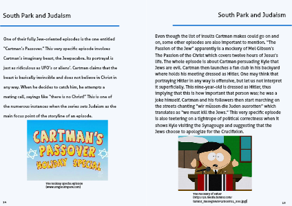 Even though the list of insults Cartman makes could go on and on, some other episodes are also important to mention. “The Passion of the Jew” apparently is a mockery of Mel Gibson’s The Passion of the Christ which covers twelve hours of Jesus’s life. The whole episode is about Cartman persuading Kyle that Jews are evil. Cartman then launches a fan club in his backyard where holds his meeting dressed as Hitler. One may think that portraying Hitler in any way is offensive, but let us not interpret it superficially. This nine-year-old is dressed as Hitler, thus implying that this is how important that person was; he was a joke himself. Cartman and his followers then start marching on the streets chanting “wir müssen die Juden ausrotten” which translates as “we must kill the Jews.” This very specific episode is also teetering on a tightrope of political correctness when it shows Kyle visiting the Synagouge and suggesting that the Jews choose to apologize for the Crucifixion.