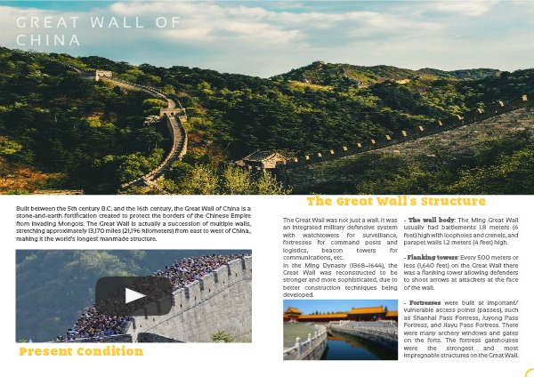 Built between the 5th century B.C. and the 16th century, the Great Wall of China is a stone-and-earth fortification created to protect the borders of the Chinese Empire from invading Mongols. The Great Wall is actually a succession of multiple walls, stretching approximately 13,170 miles (21,196 kilometers) from east to west of China., making it the world's longest manmade structure.