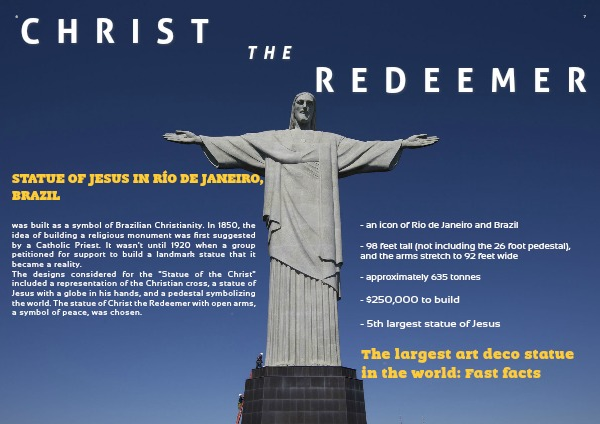 The designs considered for the "Statue of the Christ" included a representation of the Christian cross, a statue of Jesus with a globe in his hands, and a pedestal symbolizing the world. The statue of Christ the Redeemer with open arms, a symbol of peace, was chosen.