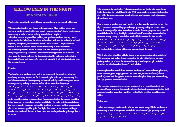 Yellow eyes emerged in the needle blanket, the size of two golf balls, as almost it was staring at her. A heavy wind shifted the woods; moonlight painting a dark shadow standing on a thick branch above. Glimmering slivers of light caught her eye, a silver blade grasped in its fist.