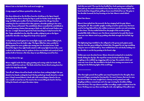 A sharp blade pressed against her sweaty light copper neck, Maeve shifting back, shrinking away from the knife’s edge. The figure filled her vision, prickly fur gliding against her arms, golden eyes staring into her chocolate brown. Curls framed the figure’s face, tight braids mixed in with messy light brown locks, a scar marked on his hairline near his eyebrow. Its face was freckled and scratched, broad jawline built in-between a flat chin, deep-set eyes flickering around her face.