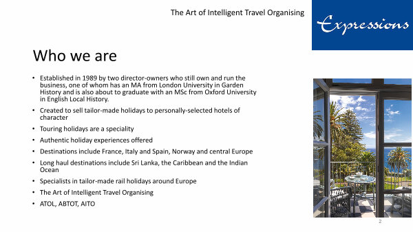 • Created to sell tailor-made holidays to personally-selected hotels of character