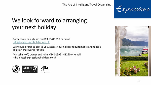 Contact our sales team on 01392 441250 or email info @ expressionsholidays. co. uk