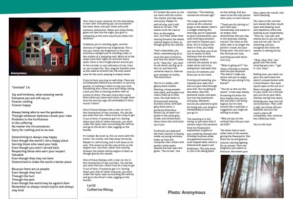Suddenly you’re standing again, and the dimness of nighttime has brightened. This is not your home; the brightness is from the enormous skylight you’re standing under, in the middle of a shopping mall. While all of the shops have their lights on and their doors open, there is not a single person around you in the corridor, or any indication of one. Even so, you accept this. Your singular footfalls echo as you walk on pristine tile, the only sound save for the music playing in empty stores.