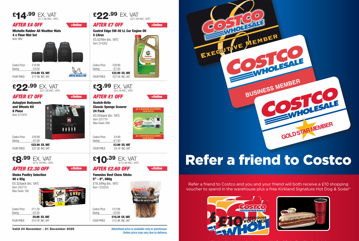 Refer a friend to Costco and you and your friend will both receive a £ 10 shopping voucher to spend in the warehouse plus a free Kirkland Signature Hot Dog & Soda!*