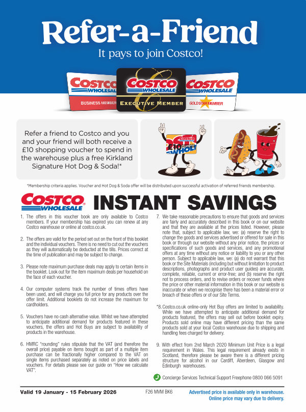 Refer a friend to Costco and you and your friend will both receive a £ 10 shopping voucher to spend in the warehouse plus a free Kirkland Signature Hot Dog & Soda!*