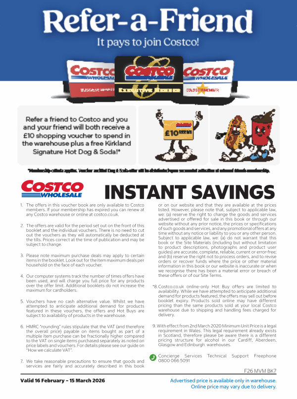 1. The offers in this voucher book are only available to Costco members. If your membership has expired you can renew at any Costco warehouse or online at costco. co. uk.