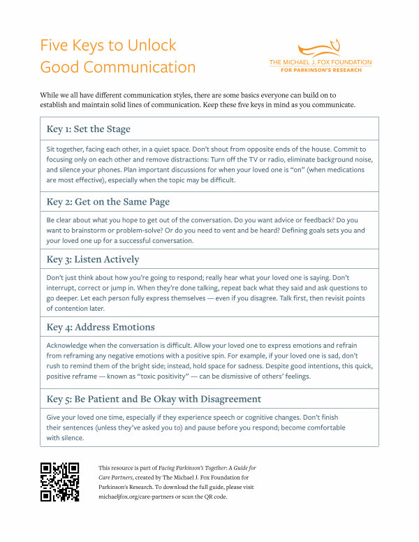 This resource is part of Facing Parkinson’ s Together: A Guide for Care Partners, created by The Michael J. Fox Foundation for Parkinson ' s Research. To download the full guide, please visit michaeljfox. org / care-partners or scan the QR code.