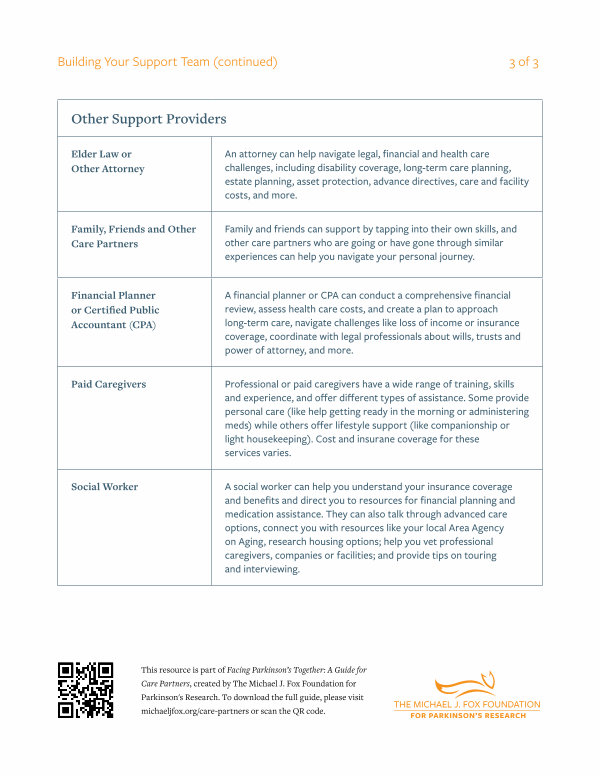 This resource is part of Facing Parkinson’ s Together: A Guide for Care Partners, created by The Michael J. Fox Foundation for Parkinson ' s Research. To download the full guide, please visit michaeljfox. org / care-partners or scan the QR code.