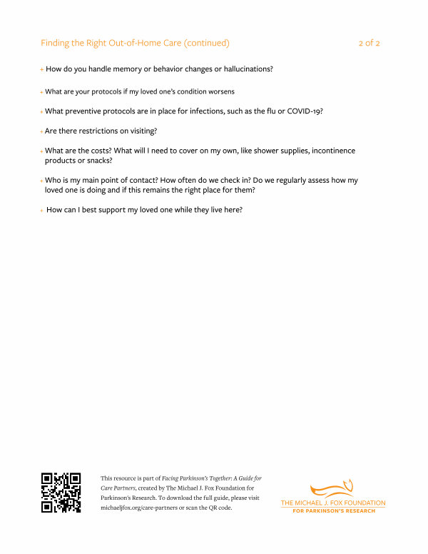This resource is part of Facing Parkinson’ s Together: A Guide for Care Partners, created by The Michael J. Fox Foundation for Parkinson ' s Research. To download the full guide, please visit michaeljfox. org / care-partners or scan the QR code.