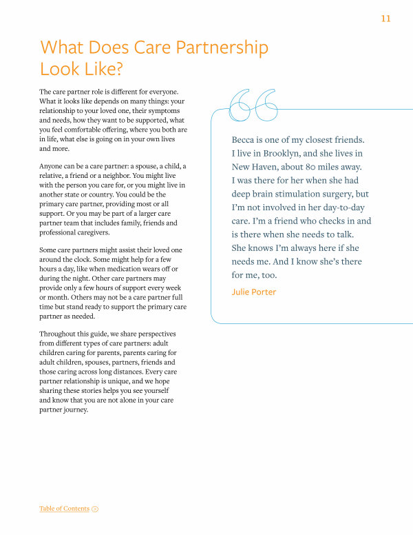 Throughout this guide, we share perspectives from different types of care partners: adult children caring for parents, parents caring for adult children, spouses, partners, friends and those caring across long distances. Every care partner relationship is unique, and we hope sharing these stories helps you see yourself and know that you are not alone in your care partner journey.