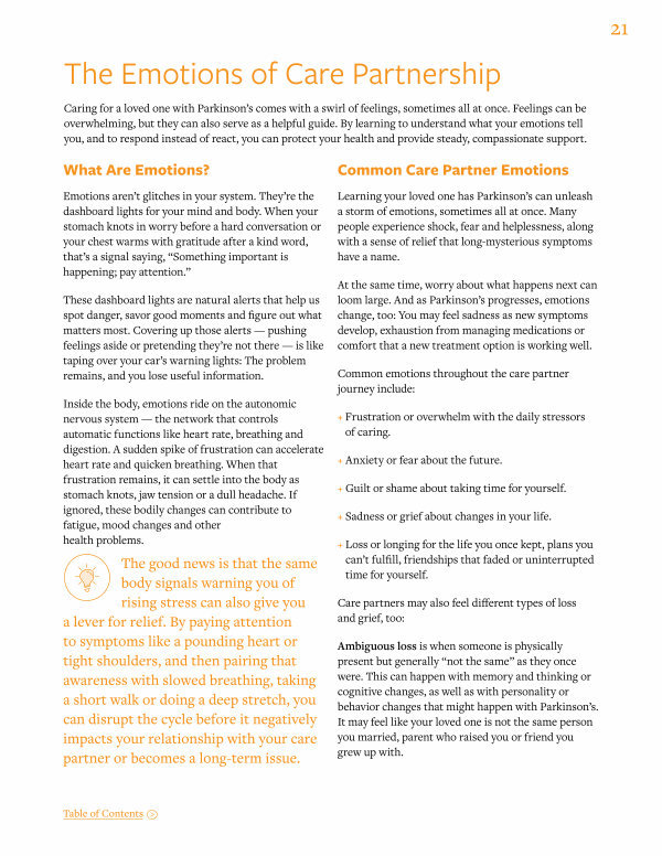 Caring for a loved one with Parkinson’ s comes with a swirl of feelings, sometimes all at once. Feelings can be overwhelming, but they can also serve as a helpful guide. By learning to understand what your emotions tell you, and to respond instead of react, you can protect your health and provide steady, compassionate support.