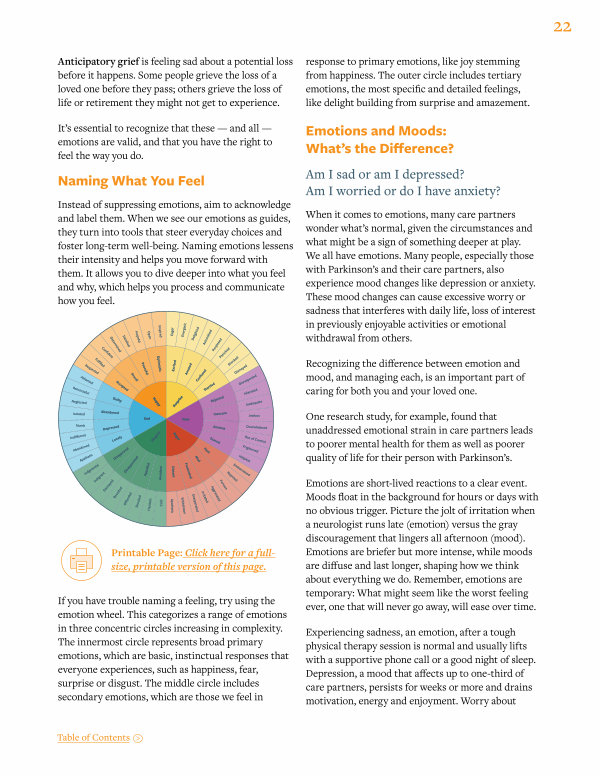 When it comes to emotions, many care partners wonder what’ s normal, given the circumstances and what might be a sign of something deeper at play. We all have emotions. Many people, especially those with Parkinson’ s and their care partners, also experience mood changes like depression or anxiety. These mood changes can cause excessive worry or sadness that interferes with daily life, loss of interest in previously enjoyable activities or emotional withdrawal from others.