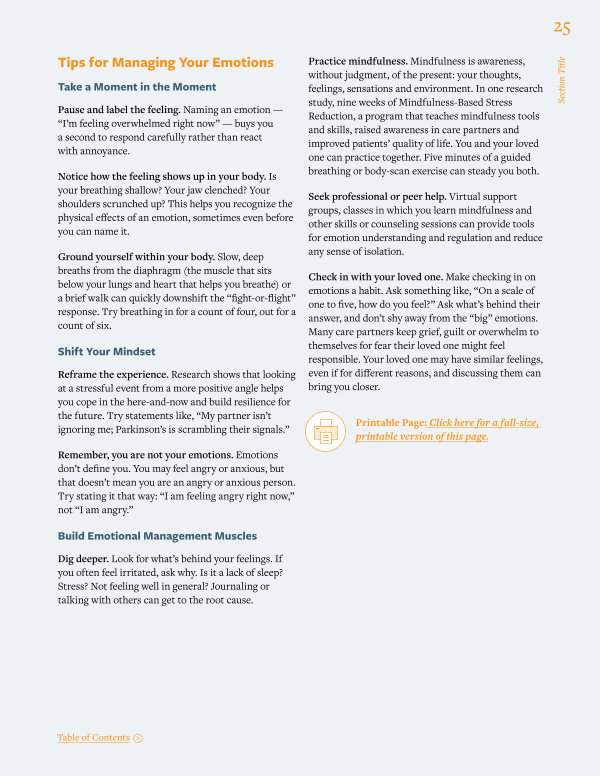 Reframe the experience. Research shows that looking at a stressful event from a more positive angle helps you cope in the here-and-now and build resilience for the future. Try statements like,“ My partner isn’ t ignoring me; Parkinson’ s is scrambling their signals.”