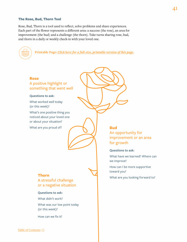 Rose, Bud, Thorn is a tool used to reflect, solve problems and share experiences. Each part of the flower represents a different area: a success( the rose), an area for improvement( the bud) and a challenge( the thorn). Take turns sharing rose, bud, and thorn in a daily or weekly check-in with your loved one.