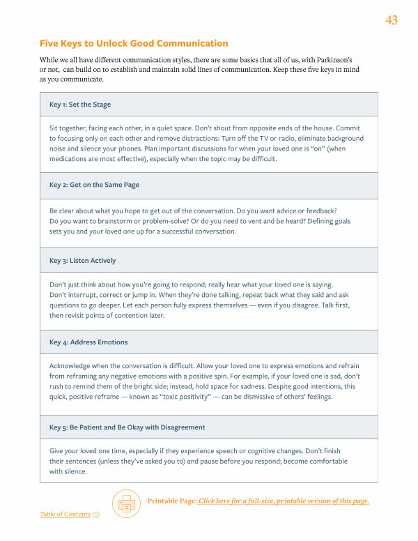 While we all have different communication styles, there are some basics that all of us, with Parkinson’ s or not, can build on to establish and maintain solid lines of communication. Keep these five keys in mind as you communicate.