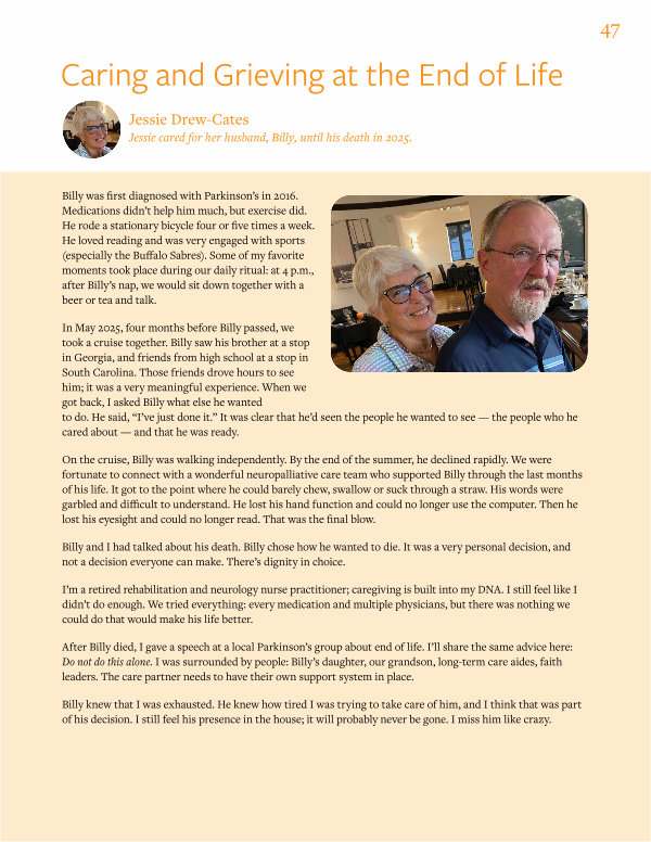 After Billy died, I gave a speech at a local Parkinson’ s group about end of life. I’ ll share the same advice here: Do not do this alone. I was surrounded by people: Billy’ s daughter, our grandson, long-term care aides, faith leaders. The care partner needs to have their own support system in place.