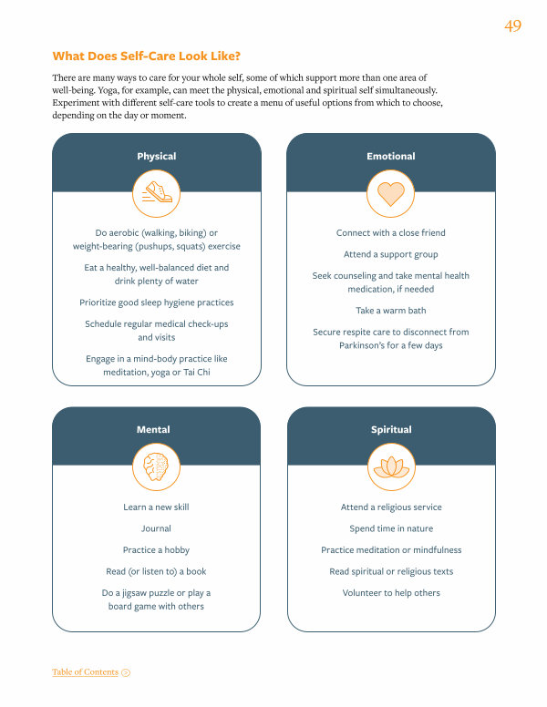 There are many ways to care for your whole self, some of which support more than one area of well-being. Yoga, for example, can meet the physical, emotional and spiritual self simultaneously. Experiment with different self-care tools to create a menu of useful options from which to choose, depending on the day or moment.