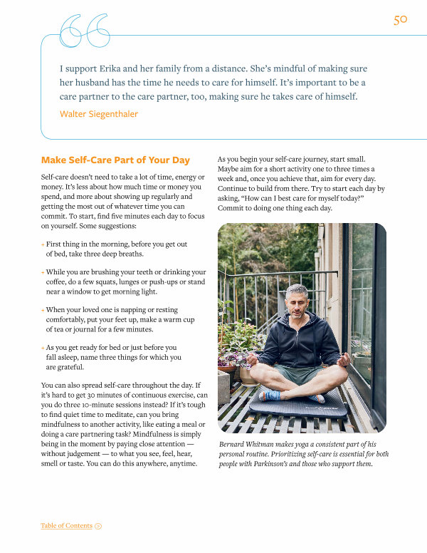 Bernard Whitman makes yoga a consistent part of his personal routine. Prioritizing self-care is essential for both people with Parkinson’ s and those who support them.