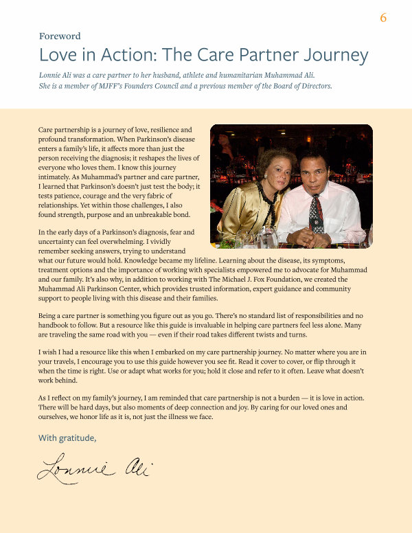 In the early days of a Parkinson’ s diagnosis, fear and uncertainty can feel overwhelming. I vividly remember seeking answers, trying to understand what our future would hold. Knowledge became my lifeline. Learning about the disease, its symptoms, treatment options and the importance of working with specialists empowered me to advocate for Muhammad and our family. It’ s also why, in addition to working with The Michael J. Fox Foundation, we created the Muhammad Ali Parkinson Center, which provides trusted information, expert guidance and community support to people living with this disease and their families.