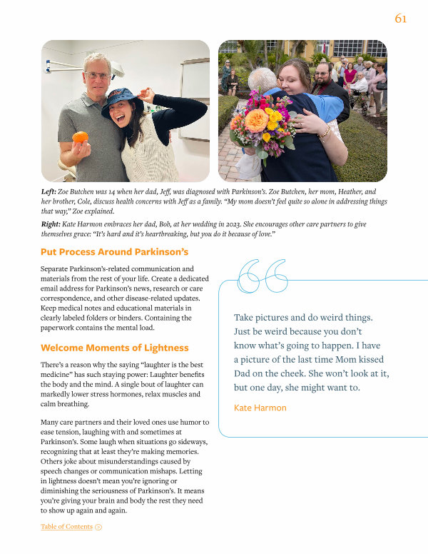 Many care partners and their loved ones use humor to ease tension, laughing with and sometimes at Parkinson’ s. Some laugh when situations go sideways, recognizing that at least they’ re making memories. Others joke about misunderstandings caused by speech changes or communication mishaps. Letting in lightness doesn’ t mean you’ re ignoring or diminishing the seriousness of Parkinson’ s. It means you’ re giving your brain and body the rest they need to show up again and again.