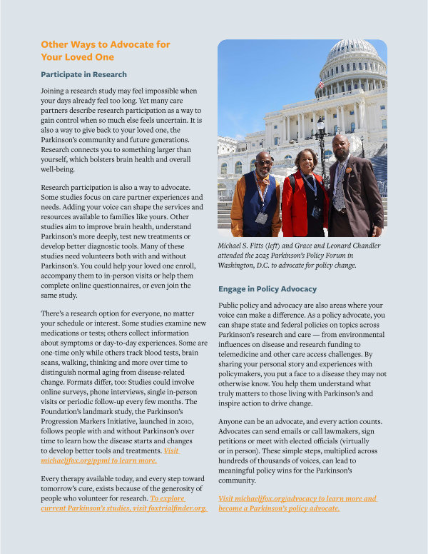 Research participation is also a way to advocate. Some studies focus on care partner experiences and needs. Adding your voice can shape the services and resources available to families like yours. Other studies aim to improve brain health, understand Parkinson’ s more deeply, test new treatments or develop better diagnostic tools. Many of these studies need volunteers both with and without Parkinson’ s. You could help your loved one enroll, accompany them to in-person visits or help them complete online questionnaires, or even join the same study.