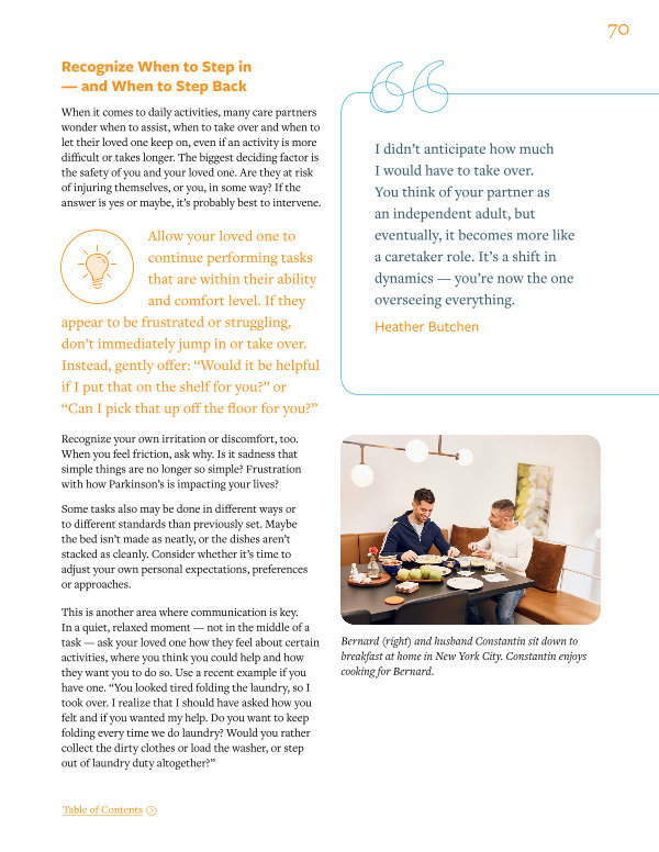 This is another area where communication is key. In a quiet, relaxed moment— not in the middle of a task— ask your loved one how they feel about certain activities, where you think you could help and how they want you to do so. Use a recent example if you have one.“ You looked tired folding the laundry, so I took over. I realize that I should have asked how you felt and if you wanted my help. Do you want to keep folding every time we do laundry? Would you rather collect the dirty clothes or load the washer, or step out of laundry duty altogether?”
