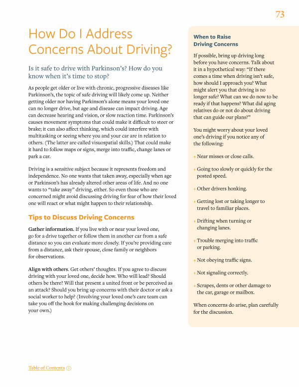 Driving is a sensitive subject because it represents freedom and independence. No one wants that taken away, especially when age or Parkinson’ s has already altered other areas of life. And no one wants to“ take away” driving, either. So even those who are concerned might avoid discussing driving for fear of how their loved one will react or what might happen to their relationship.