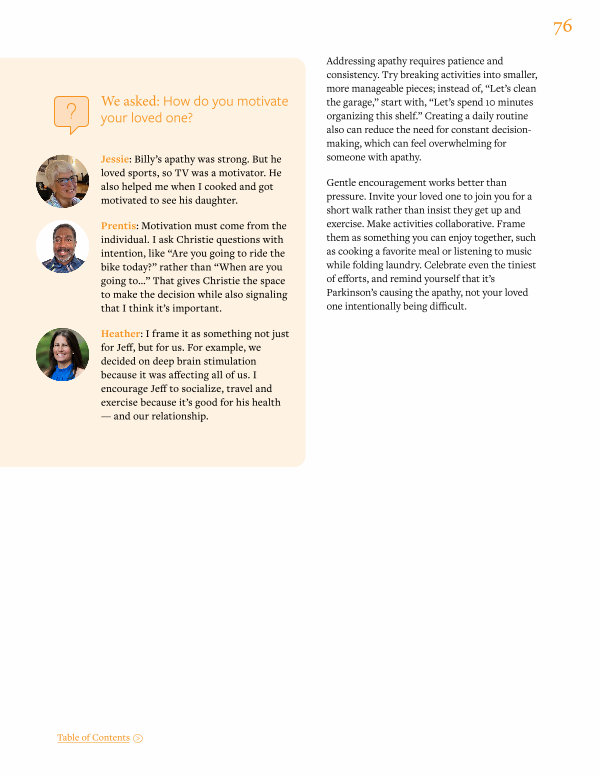 Gentle encouragement works better than pressure. Invite your loved one to join you for a short walk rather than insist they get up and exercise. Make activities collaborative. Frame them as something you can enjoy together, such as cooking a favorite meal or listening to music while folding laundry. Celebrate even the tiniest of efforts, and remind yourself that it’ s Parkinson’ s causing the apathy, not your loved one intentionally being difficult.