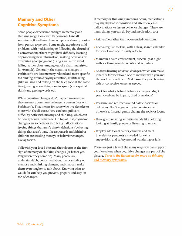 These are just a few of the many ways you can support your loved one when cognitive changes are part of the picture. Turn to the Resources for more on thinking and memory symptoms.