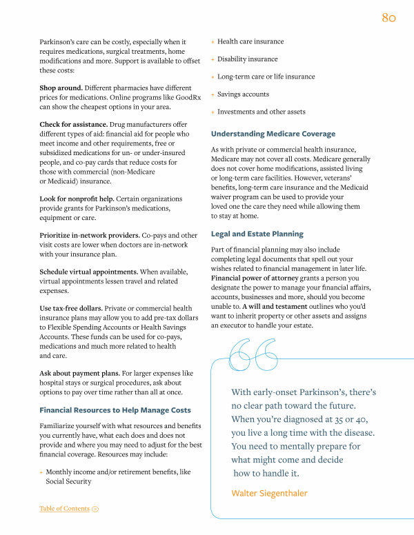 Parkinson’ s care can be costly, especially when it requires medications, surgical treatments, home modifications and more. Support is available to offset these costs: