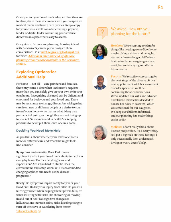 Our guide to future care planning, Looking Ahead with Parkinson’ s, can help you navigate these conversations. Visit michaeljfox. org / lookingahead for more. Additional later and end-of-life care planning resources are available in the Resources section.