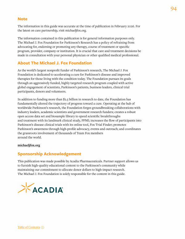 This publication was made possible by Acadia Pharmaceuticals. Partner support allows us to furnish high-quality educational content to the Parkinson’ s community while maintaining our commitment to allocate donor dollars to high-impact research. The Michael J. Fox Foundation is solely responsible for the content in this guide.