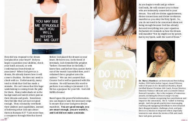 As you begin to walk and go where God leads, He will connect you to those who are intimately connected to your dream.  You will see divine appointments, divine connections and divine revelation manifest as you obey the Holy Spirit.  So, you do not need to be concerned about not being enough because God has already factored everything into your equation.  Zechariah 4:6 reminds us how the dream will manifest “Not by might nor by power, but by my Spirit, saith the Lord of Hosts.” Dr. Mary J. Huntley is an International Best Selling Author, 2019 Indie Author Legacy Award Winner, wife of 44 years to Dr. Ronald Lee Huntley, Board Certified Master Christian Life Coach, Prayer Warrior, Domestic Violence Advocate and a Licensed Clinical Pastoral Counselor.  She is the recipient of numerous awards, including the Prince George’s County Governor’s Citation recognizing her contributions and impact in the community.  She is “called’ to hurting people.  And she spends quality time encouraging, coaching and equipping individuals to move beyond their disappointments, challenges, hurt, and pain.  She is on a mission to empower others (especially women) to soar above the storms of life and reach their God-given potential. FHM 11