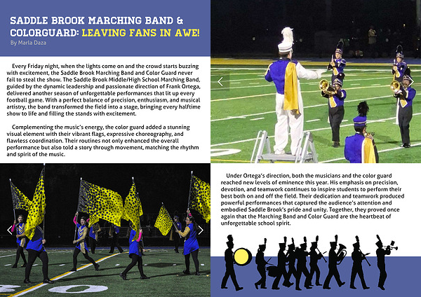 Every Friday night, when the lights come on and the crowd starts buzzing with excitement, the Saddle Brook Marching Band and Color Guard never fail to steal the show. The Saddle Brook Middle/High School Marching Band, guided by the dynamic leadership and passionate direction of Frank Ortega, delivered another season of unforgettable performances that lit up every football game. With a perfect balance of precision, enthusiasm, and musical artistry, the band transformed the field into a stage, bringing every halftime show to life and filling the stands with excitement.