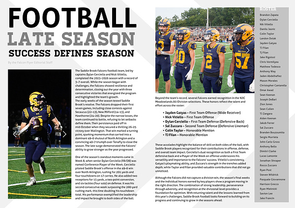The Saddle Brook Falcons football team, led by captains Dylan Cerciello and Nick Vitiello, completed the 2025–2026 season with a record of 3–7 overall. While the season began with challenges, the Falcons showed resilience and determination, closing out the year with three consecutive victories that energized the program and highlighted the team’s growth.