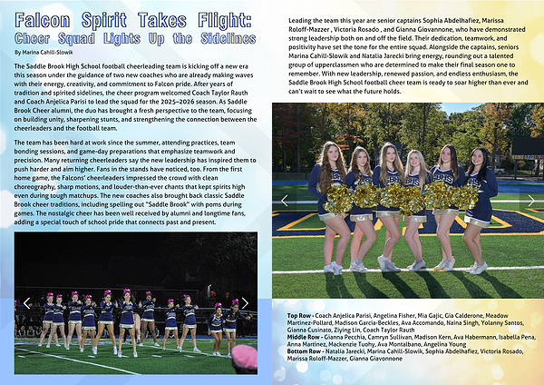 Leading the team this year are senior captains Sophia Abdelhafiez, Marissa Roloff-Mazzer , Victoria Rosado , and Gianna Giovannone, who have demonstrated strong leadership both on and off the field. Their dedication, teamwork, and positivity have set the tone for the entire squad. Alongside the captains, seniors Marina Cahill-Slowik and Natalia Jarecki bring energy, rounding out a talented group of upperclassmen who are determined to make their final season one to remember. With new leadership, renewed passion, and endless enthusiasm, the Saddle Brook High School football cheer team is ready to soar higher than ever and can’t wait to see what the future holds.