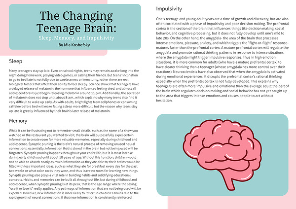 One’s teenage and young adult years are a time of growth and discovery, but are also often correlated with a phase of impulsivity and poor decision making. The prefrontal cortex is the section of the brain that influences things like decision making, social behavior, and cognitive processing, but it does not fully develop until one’s mid to late 20s. On the other hand, the amygdala- the area of the brain that processes intense emotions, pleasure, anxiety, and which triggers the “fight-or-flight” response- matures faster than the prefrontal cortex. A mature prefrontal cortex will regulate the amygdala and promote rational thinking patterns in response to intense situations where the amygdala might trigger impulsive responses. Thus in high emotion situations, it is more common for adults (who have a mature prefrontal cortex) to have clearer thinking than a teenager (whose amygdala has more control over their reactions). Neuroscientists have also observed that when the amygdala is activated during emotional experiences, it disrupts the prefrontal cortex’s rational thinking, especially when the prefrontal cortex is not fully developed. This explains why teenagers are often more impulsive and emotional than the average adult; the part of the brain which regulates decision making and social behavior has not yet caught up to the area that triggers intense emotions and causes people to act without hesitation.
