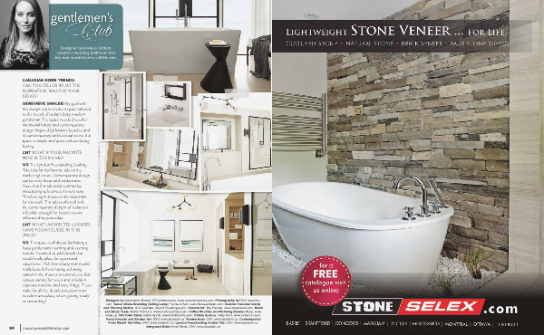 Designer by Genevieve Ghaleb, XYContemporary, www. xycontemporary. com; Photography by DXV, www. dxv. com; Seven Globe Branding Ceiling Lamp, France & Son, www. franceandson. com; Custom Concrete Vanity and Shaving Station, 910 Castings, www. 910castings. com; Custom Art, Zoe Pawlak, www. zoepawlak. com; Black and Glass Table, Martin Patrick 3, www. martinpatrick3. com; Coffee Machine and Warming Drawer, Miele, www. miele. ca; Old-Town Stool, hollis + morris, www. hollismorris. com; Ombre Sconce, Holly Hunt, www. hollyhunt. com; Percy Faucets and Shower Set, DXV, www. tapsbath. ca; Showerhead, DXV, www. tapsbath. ca; Contemporary Floor Mount Tub Filler, DXV, www. tapsbath. ca; Lyndon Freestanding Soaker Tub, DXV, www. tapsbath. ca; Integrated Bidet Smart Toilet, DXV, www. tapsbath. ca