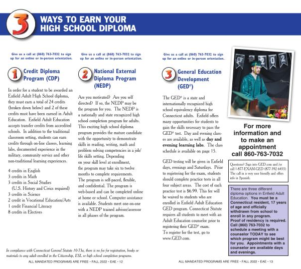 There are three different diploma options in Enfield Adult Education . You must be a Connecticut resident , 17 years of age and officially withdrawn from school to enroll in any program . Proof of residency is required . Call ( 860 ) 763-7032 to schedule a meeting with a counselor TODAY to see which program might be best for you . Appointments with a counselor are available days and evenings .